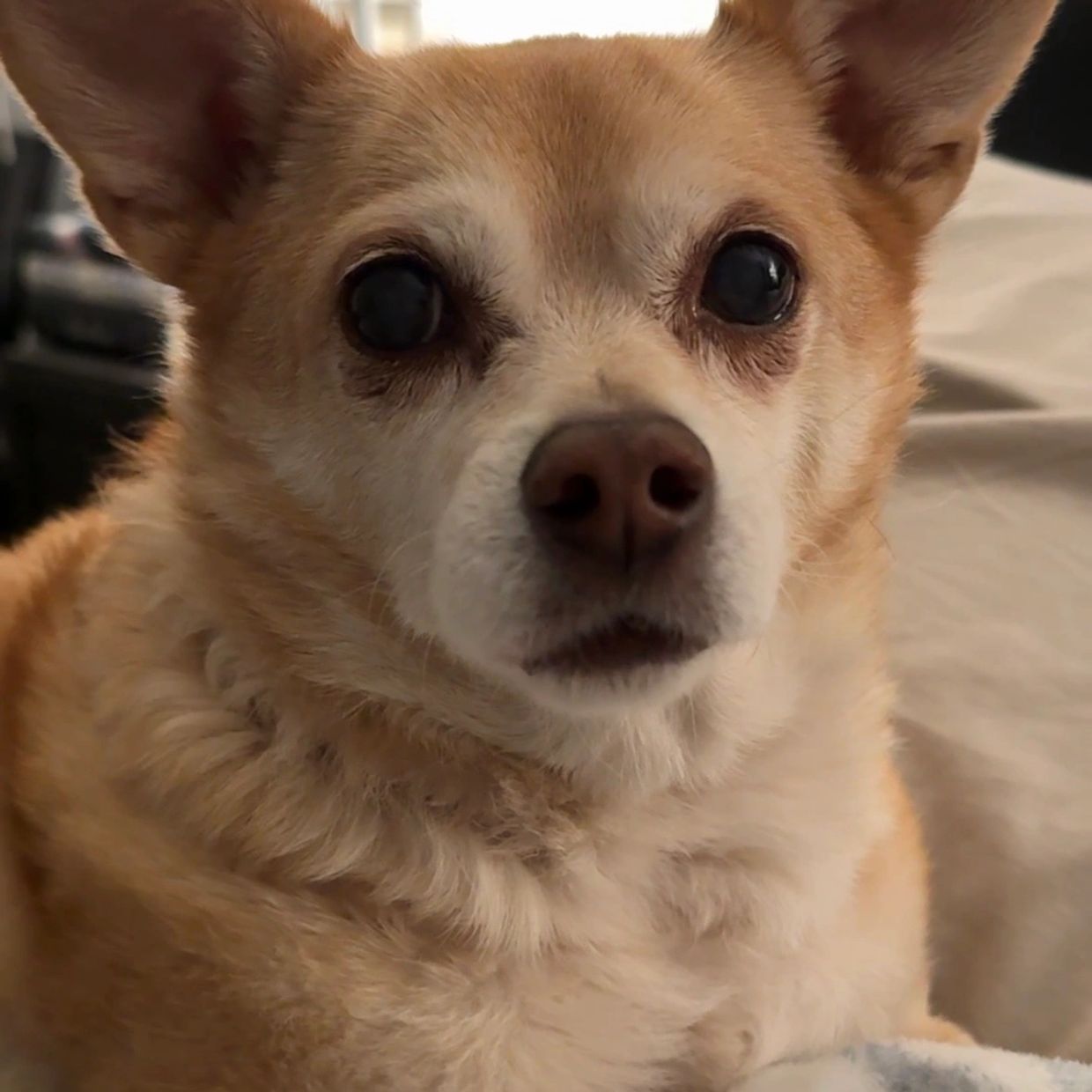 Abigail is a 13-year-old Chihuahua mix, which in human years makes her ancient—but you’d never know it by the way she charges through life like a caffeinated general. She came to us in 2013 via Pooches on the Move in Tennessee, the runt of her litter and originally named Tippy because her tiny, unreliable legs refused to cooperate with gravity. We regret, daily and profoundly, that we did not also adopt her brother, Topper, who looked exactly like her. This regret has aged like fine wine and mild guilt.